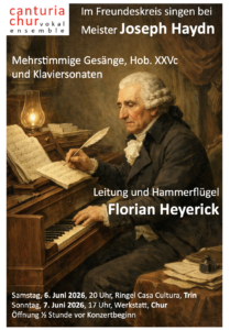Das Vokalensemble Canturia Chur präsentiert weltliche Lieder von Joseph Haydn – charmante, witzige und nachdenkliche Miniaturen nach Texten von Gellert, Lessing, Gleim und anderen Dichtern des 18. Jahrhunderts.